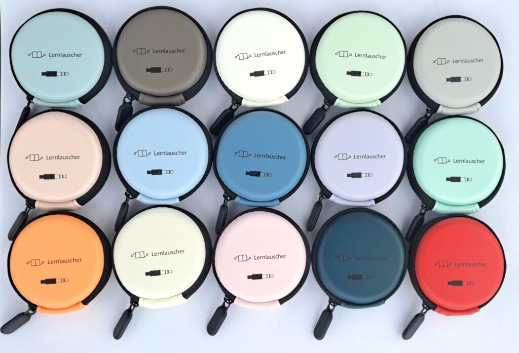Ein praktisches Aufbewahrungsetui mit einem hochwertigen Reissverschluss. Die Seiten lassen sich mit einem wasserfesten Stift gut beschreiben. Das Netz im Inneren vereinfacht das Verstauen der Kopfhörer. in der Serie 2 der Lernlauscher sind die Etuis in total 15 Farben vorhanden. Damit erkennt man von weitem das eigene Etui.
