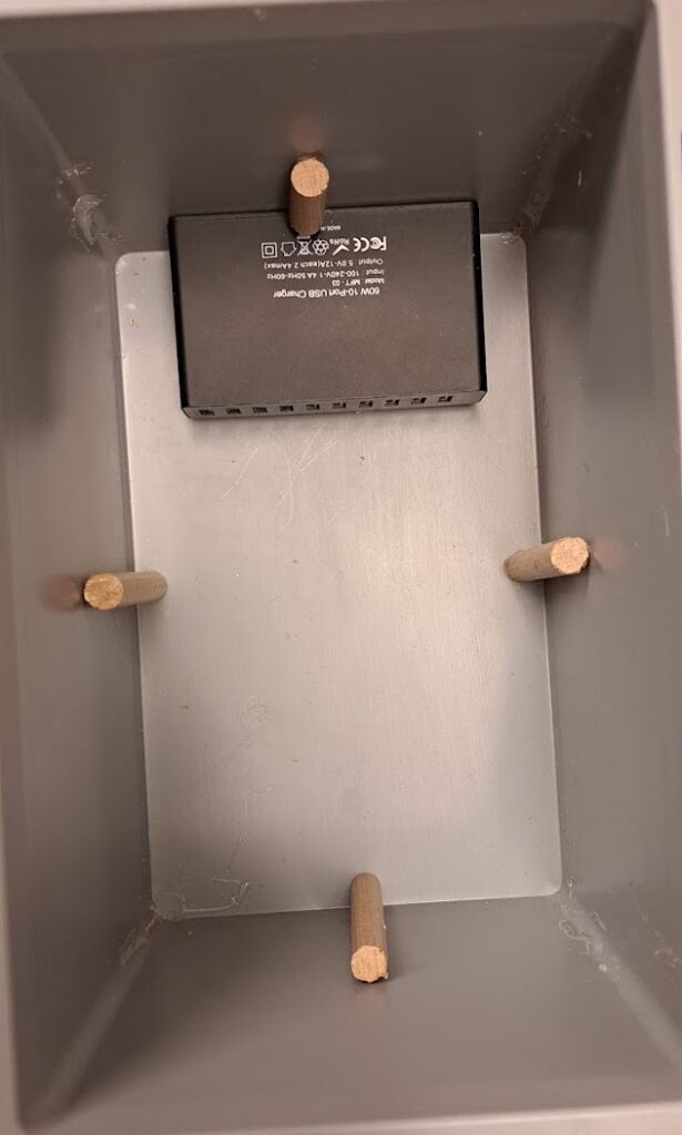 Die Temperatur im Inneren der Box stieg bei meinem Test von 30min Ladezeit nur auf lauwarm an. Gleich neben dem Netzteil habe ich zwei Löcher in die Wand gebohrt. Dadurch zieht die Luft an der wärmsten Stelle vorbei durch die undichten Seiten beim Brett. Das scheint bereits zu genügen als Belüftung. Die Ladeeinheiten werden nur lauwarm.