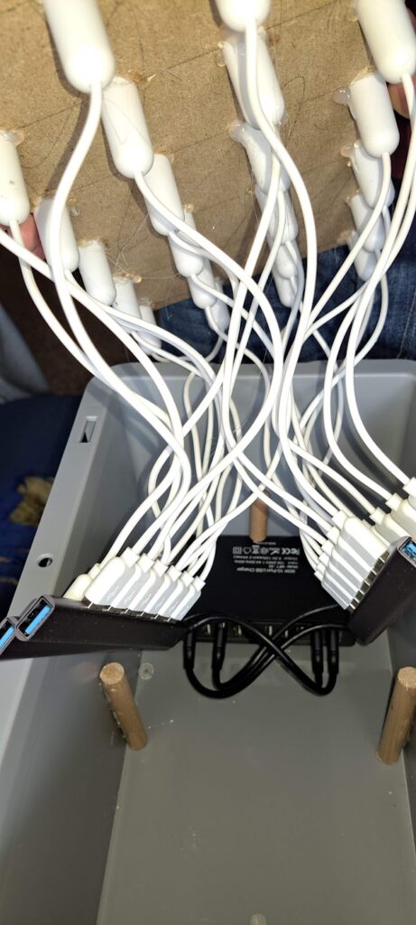 Achtung: Ich habe hier ein 10er Ladegerät genommen in der Annahme, dass ich die freien Ports direkt für die Ladeeinheiten nutzen kann. Leider sind aber die Kabel etwas zu kurz. Alternative Ladeeinheiten sind derzeit (März 2024) in Planung. Diese Version geht aber am besten, wenn alle Einheiten bei den 7in1 Hubs eingesteckt werden und wiederum die Hubs dann beim Netzteil.